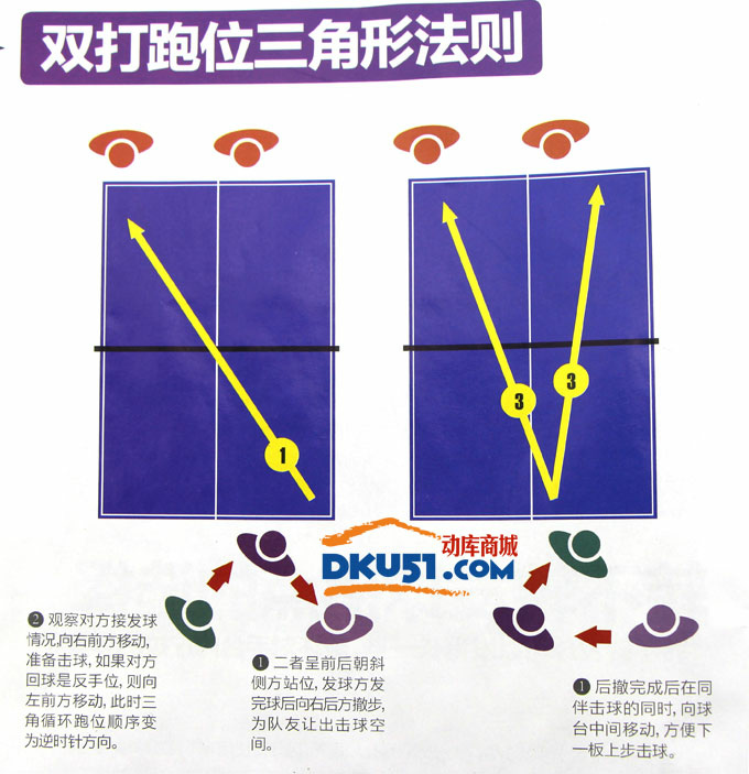 不论如何,两个右手都要不停进行站位循环来找到最佳击球位置。但实际来球的线路并不固定,更需要双打选手平时的练习养成较高的默契感。