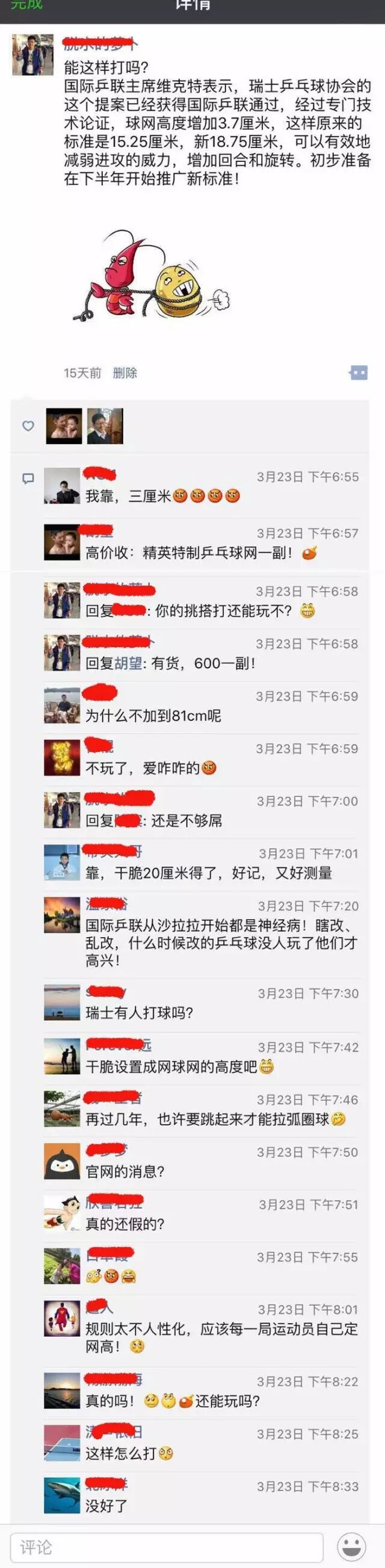 “国际乒联主席维克特表示:瑞士乒乓球协会的这个提案已经获得国际乒联通过,经过专门技术论证,球网高度增加3.7厘米,这样原来的标准是15.25厘米,新的球网高度将达到18.95厘米,可以有效地减弱进攻的威力,增加回合和旋转。初步准备在下半年开始推广新标准!”就是这样一条微信消息在业余乒乓球圈像“病毒”一样蔓延。